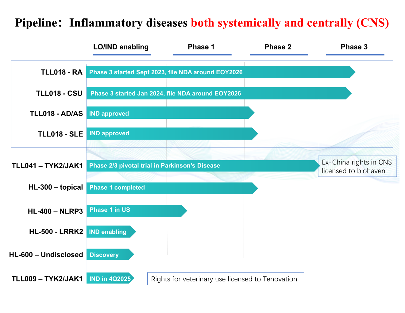 TLL041/BHV-8000 is a brain penetrant highly selective dual TYK2/JAK1 inhibitor for neuroinflammatory diseases such as Alzheimer's and Parkinson’s diseases. The ex-China rights were licensed to Biohaven which has completed Phase 1 trials and demonstrated very good safety, pharmacokinetics and brain-penetration.